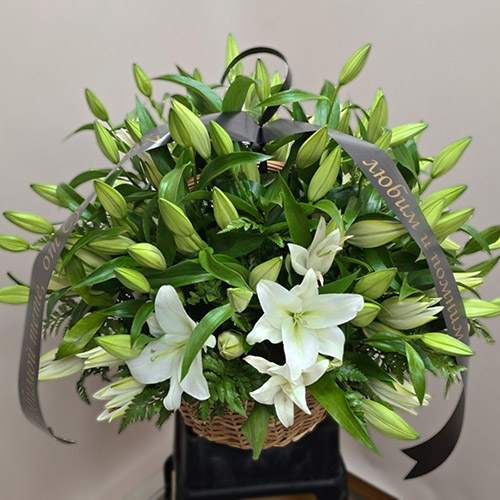Траурная корзина с белыми лилиями — это скорбный и благородный символ памяти и уважения. Белоснежные лепестки олицетворяют чистоту души, покой и светлый путь, а сама композиция звучит как искреннее прощальное слово. Такой букет помогает выразить чувства любви и благодарности, сохраняя образ дорогого человека в сердце. Корзина с живыми лилиями станет достойным сопровождением в момент прощания, подчеркнув светлую скорбь и глубину воспоминаний.